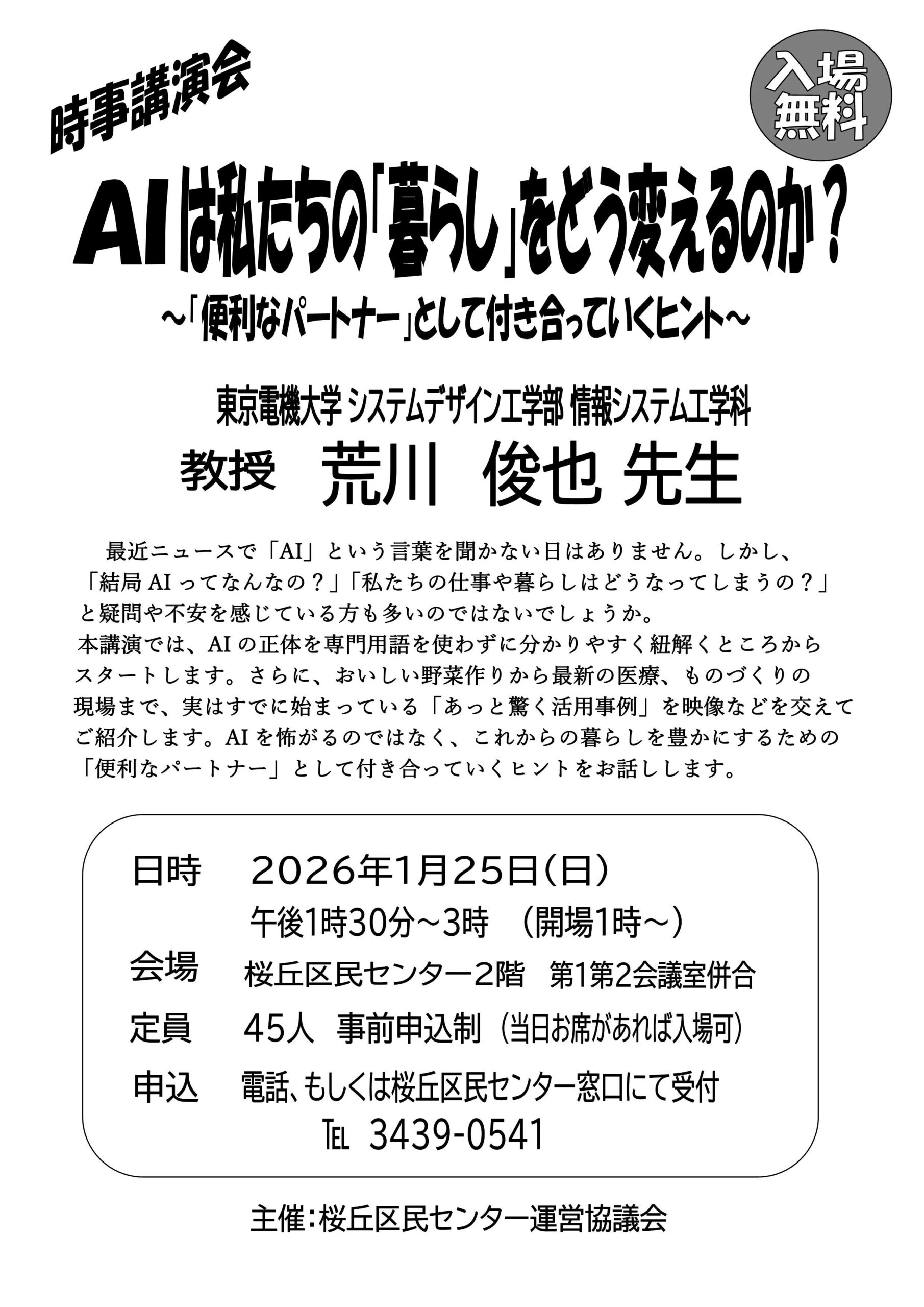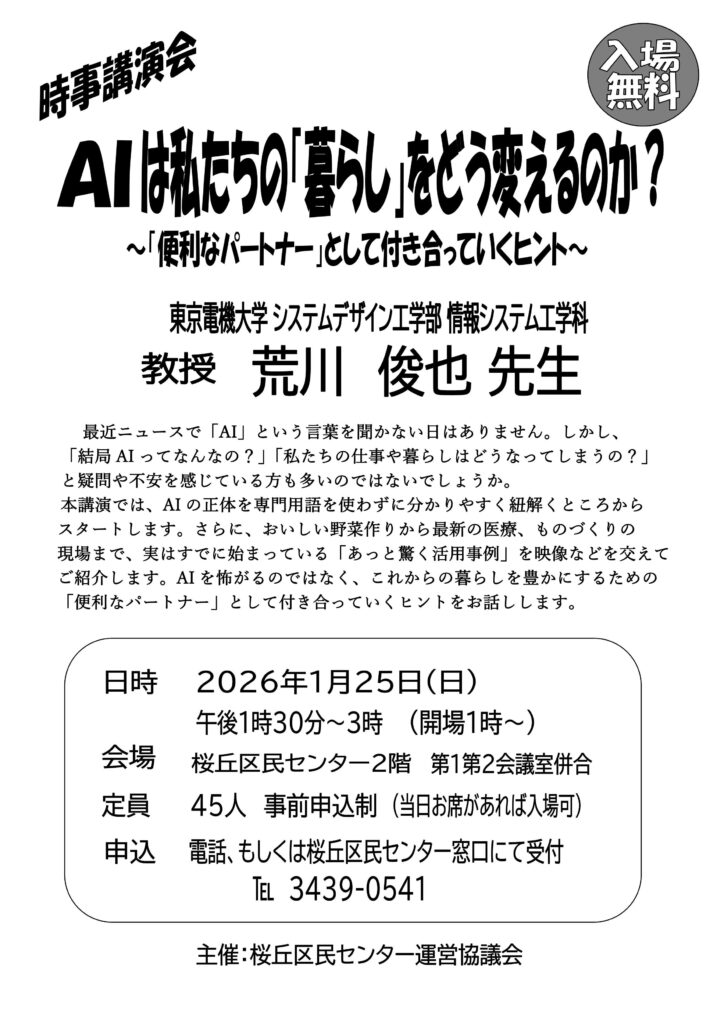 [1/25]時事講演会『AIは私たちの「暮らし」をどう変えるのか?』開催案内 2025年12月24日 最終更新日時 : 2025年12月26日 tsuboiyoji 時事講演会『AIは私たちの「暮らし」をどう変えるのか?』を1月25日(日)に開催します。皆様、奮ってご参加ください。