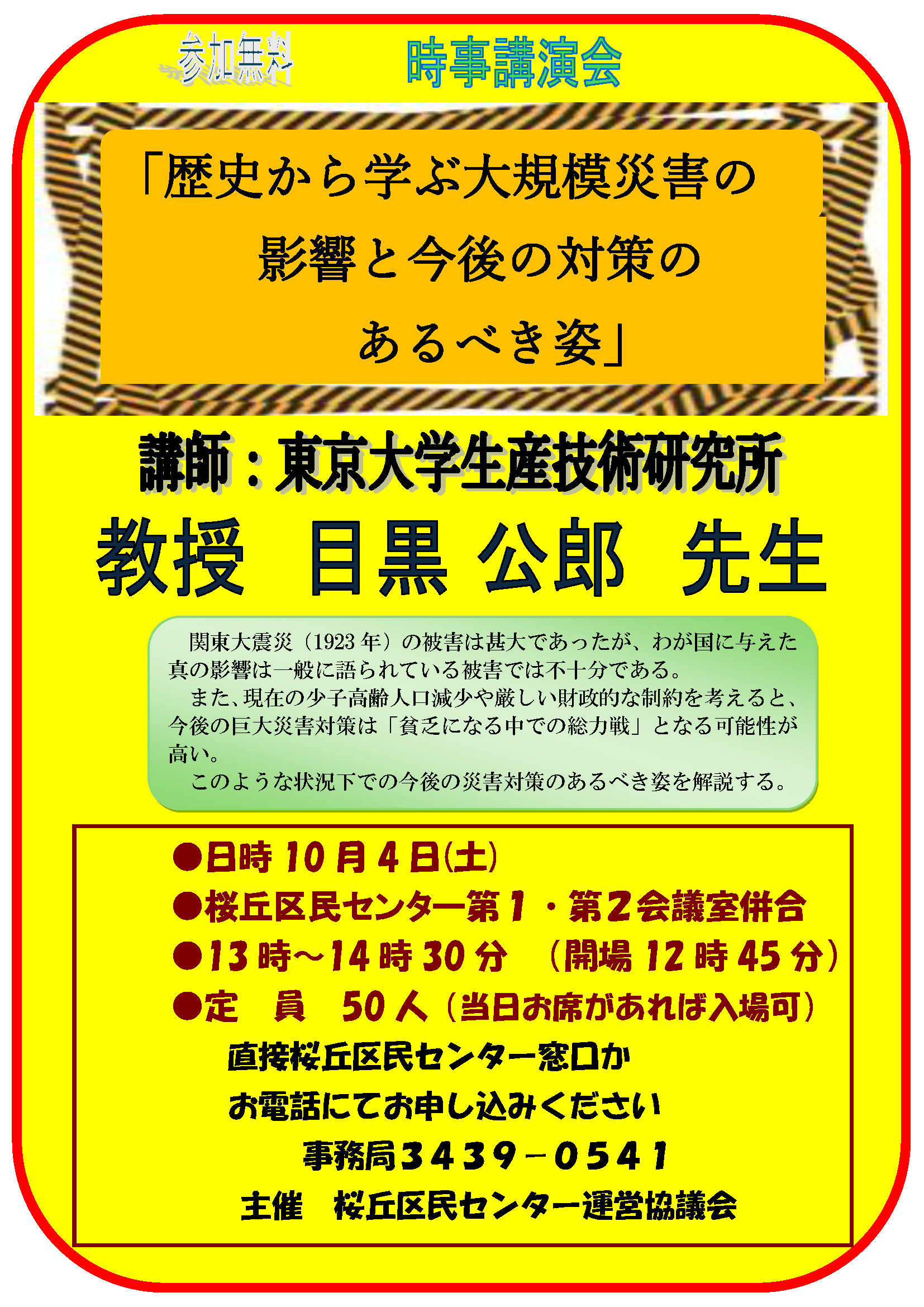 [10/4]時事講演会「歴史から学ぶ大規模災害の影響と今後の対策のあるべき姿」開催案内 2025年9月11日 最終更新日時 : 2025年9月22日 tsuboiyoji 時事講演会「歴史から学ぶ大規模災害の影響と今後の対策のあるべき姿」を開催します。参加費は無料です。皆様奮ってご参加ください。