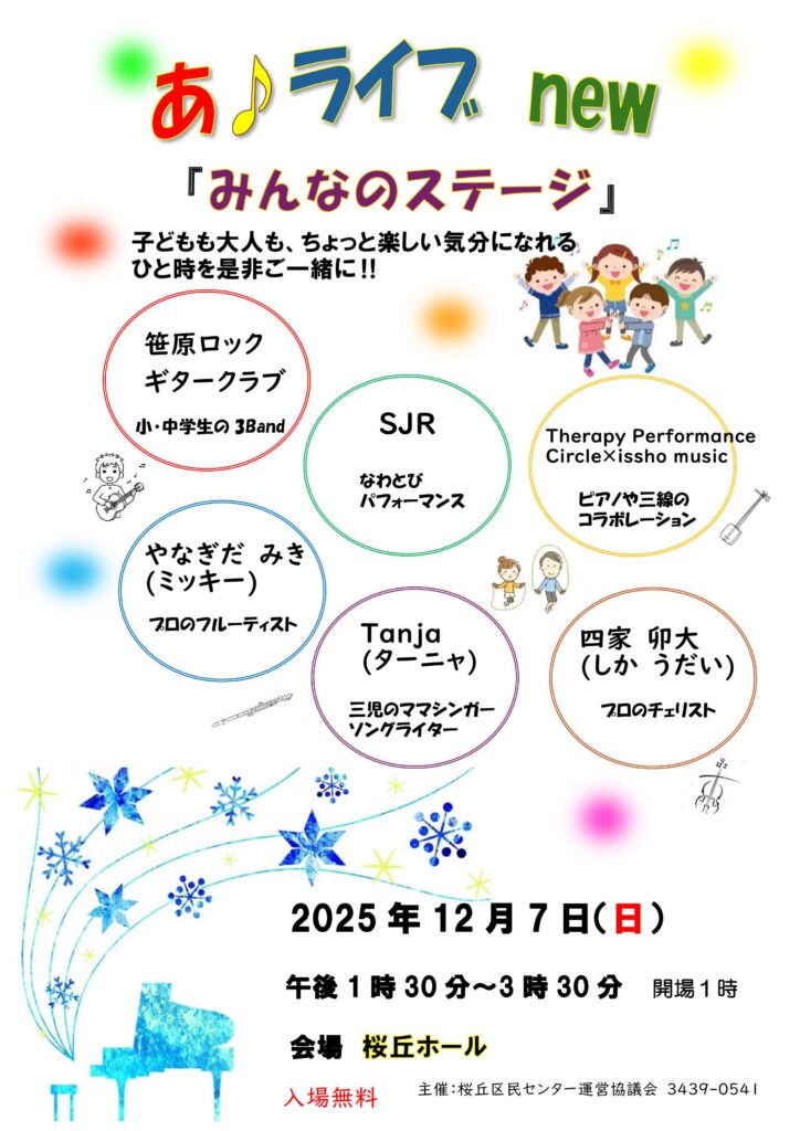 [12/7]あ♪ライブnew「みんなのステージ」開催案内 2025年11月20日 最終更新日時 : 2025年11月20日 tsuboiyoji あ♪ライブnew「みんなのステージ」を12月7日(日)に開催します。参加は無料です。皆様、奮ってご参加ください。