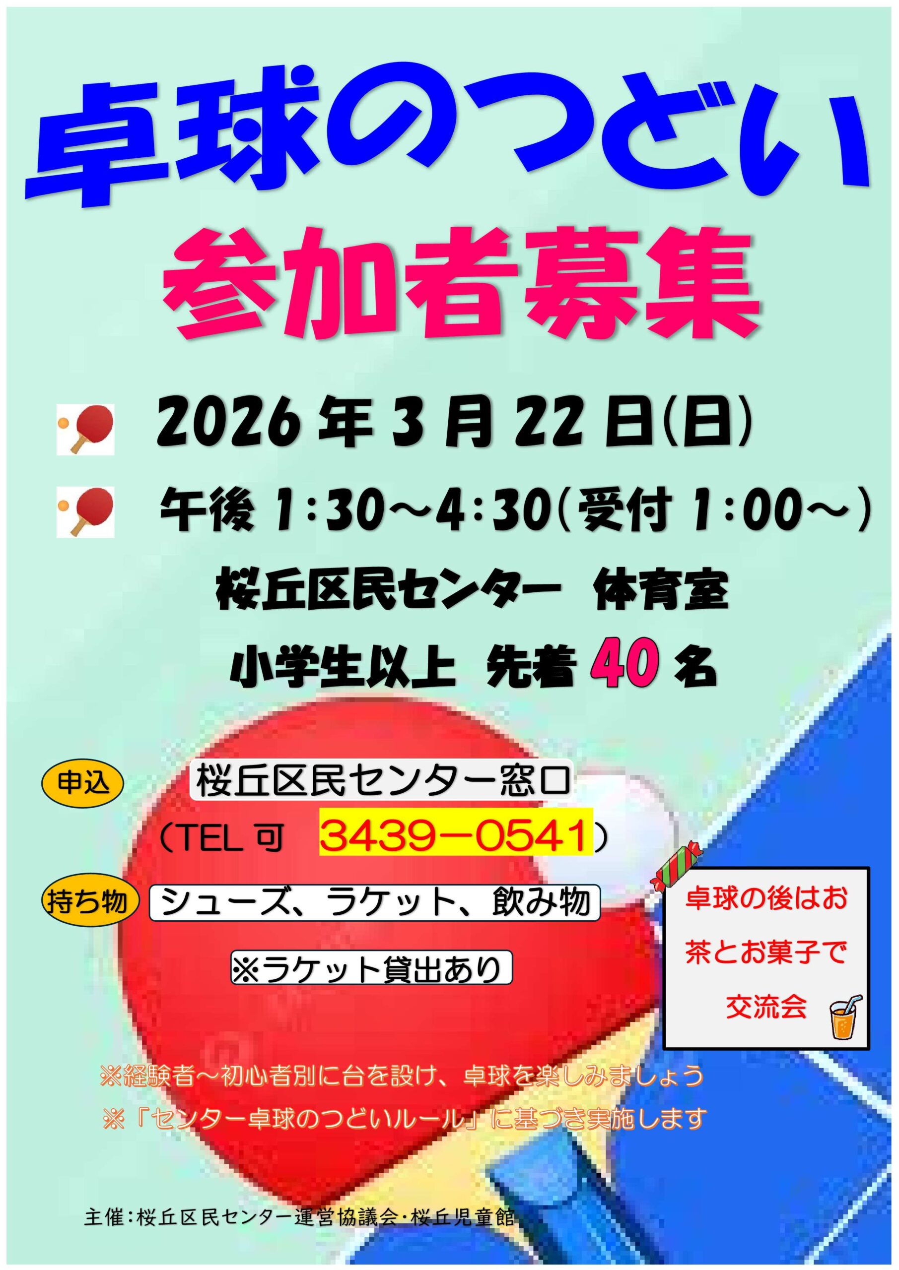 3月22日(日)に「卓球のつどい」を開催します。皆様、奮ってご参加ください。