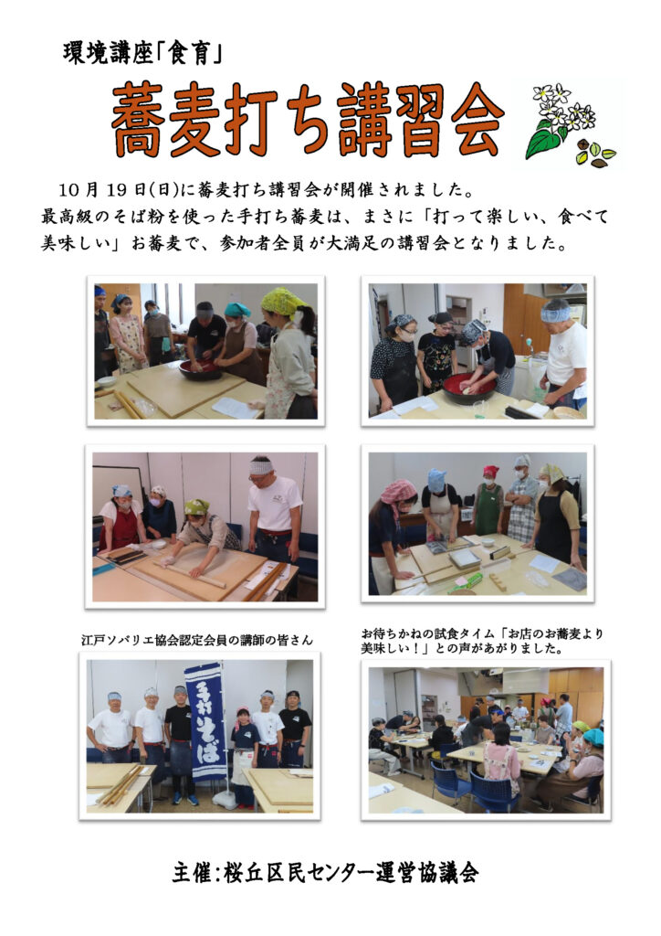 10月19日(日)に開催された「蕎麦打ち講習会」の様子を報告いたします。